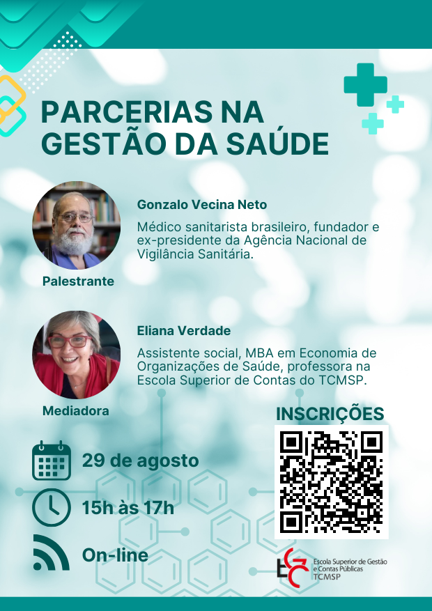 Palestrante: Gonzalo Vecina Neto - Médico sanitarista brasileiro, fundador e ex-presidente da Agência Nacional de Vigilância Sanitária. É um dos idealizadores do Sistema Único de Saúde e professor da Faculdade de Saúde Pública da Universidade de São Paulo.