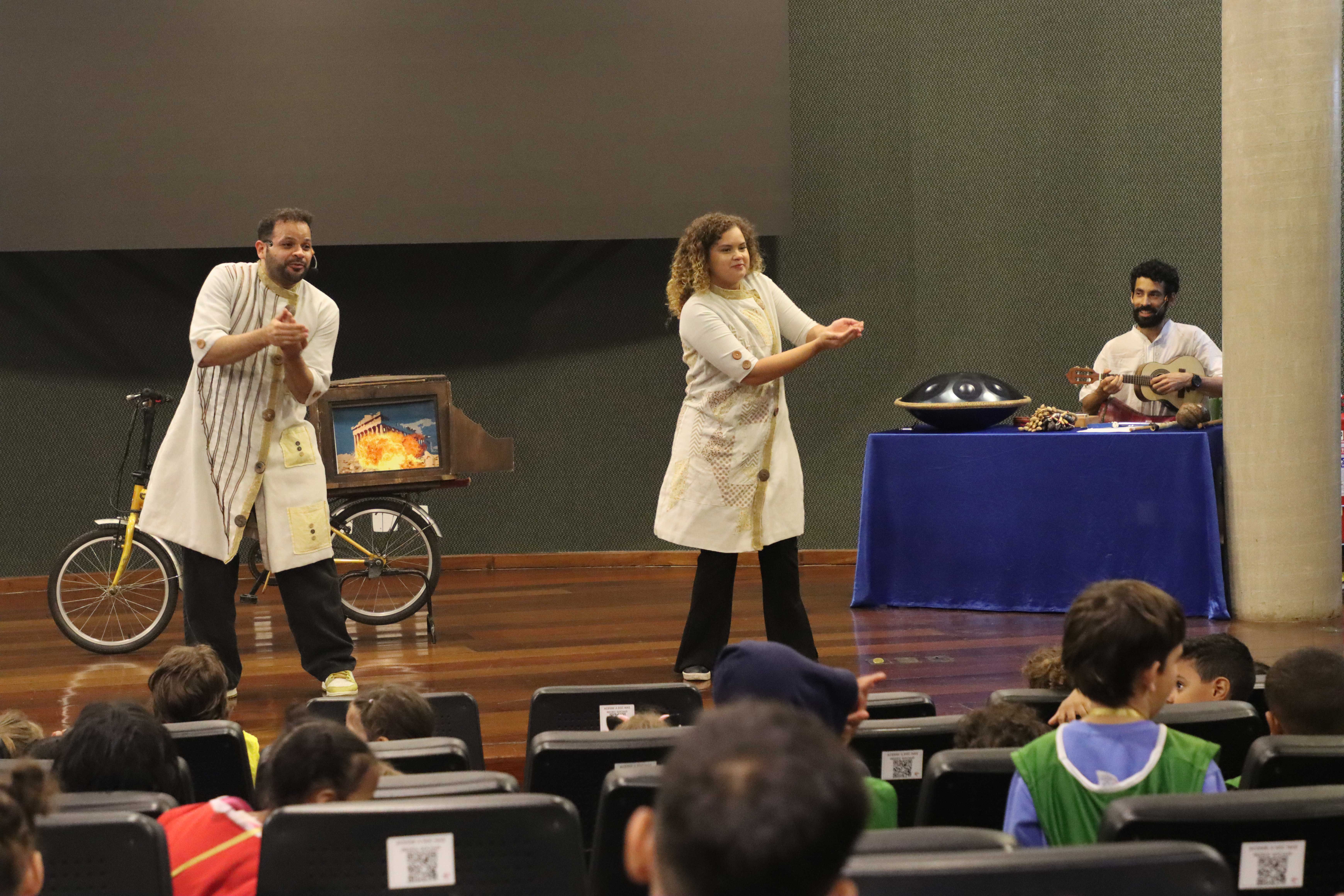 A peça colocou em cena histórias épicas da mitologia grega, como as aventuras de Ulisses e o mito de Ícaro, utilizando a técnica japonesa Kamishibai, que combina imagens ilustradas com narrativa oral. A apresentação foi enriquecida pela interpretação em Libras, garantindo acessibilidade e inclusão para todos os participantes. Com classificação livre e duração de 50 minutos, o espetáculo encantou crianças e adultos, proporcionando uma experiência sensorial e educativa.